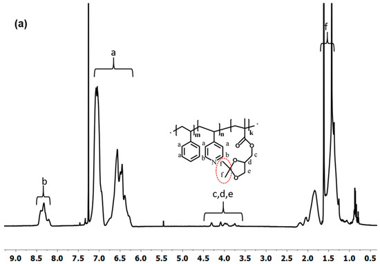 A comparison of 1H-NMR spectra of PS71-b-P4VP26-b-PSMA3145 polystyrene-b-poly(4-vinylpyridine)-b-poly(solketal methacrylate) and polystyrene-b-poly(4-vinylpyridine)-b-poly(glyceryl methacrylate) PS71-b-P4VP26-b-PGMA3145 is shown in Figure 6a,b. The appearance of new signals at 5.3 and 5.5 ppm corresponds to two hydroxyl groups (–OH) of GMA units, whereas the signals at 3.7–4.2 ppm represent five protons of the solketal moiety, which are shifted up field due to the replacement of the carbon atom with a hydrogen atom. A PS-b-P4VP-b-PSMA membrane was also protonated by HCl during the acidic hydrolysis of the ketal moieties of the PSMA block, resulting in temporarily charged PS-b-PQ4VP-b-PGMA (PQ4VP stands for quarternized P4VP) membranes because of the 4-vinyl pyridine moiety quaternization. However, the temporary quarternized P4VP block was deprotonated successfully by dipping the membrane in 0.1 M sodium hydroxide solution.