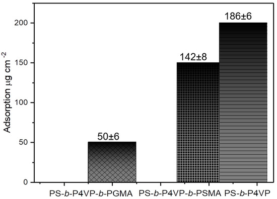 The low retention rate to the protein demonstrates that increasing the membrane hydrophilicity by incorporating hydroxyl groups containing PGMA results in a decreased fouling [60]. Further on, the high hydrophilicity and the antifouling behavior of PS-b-P4VP, pristine PS71-b-P4VP26-b-PSMA3145, and modified PS71-b-P4VP26-b-PGMA3145 membranes were confirmed by static hemoglobin adsorption experiments at 25 °C in PBS buffer (pH 7.4). The hydrodynamic diameter of hemoglobin (IEP = 6.8) is 6.4 nm as stated by the supplier. The results of the adsorption experiments are shown in Figure 8. The modified surfaces were tested in comparison to the untreated triblock terpolymer surfaces. The highest hemoglobin adsorption found for PS74-b-P4VP26162 membranes can be attributed to chelation of the iron ions from hemoglobin by the free electron pair of the P4VP nitrogen atom [61,62], whereas a decrease in adsorption value was observed when P4VP pores were covered with a hydrophobic PSMA block. At the given pH value, hemoglobin is not significantly charged (IEP = 6.8) and the membranes are also neutral, which allows the adsorption of hemoglobin to occur because of the hydrophobic/hydrophilic balance of the membranes. PS-b-P4VP-b-PGMA membranes decorated with hydrophilic PGMA block showed the smallest hemoglobin adsorption among all tested membranes due to strong hydration of the surface, which gives the surface an antifouling property. A remarkable decrease in the adsorption of protein value corresponds to an increase in hydrophilicity of the membrane. The hydrophilic membrane surfaces form hydration layers, which may reduce the adhesion force between the membrane and protein [63]. This significant improvement in the protein adsorption resistance has a profound effect on the long-term filtration of proteins. The antifouling property of PS-b-P4VP-b-PGMA membranes will be investigated in the future.