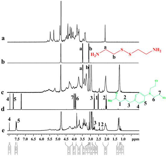 1H NMR spectra of Hep (a), cystamine (Cys) (b), Hep-Cys (c), Chl (d), and Hep–Chl (e) conjugate. CDCl3 is used as a solvent for Chl and D2O for others.