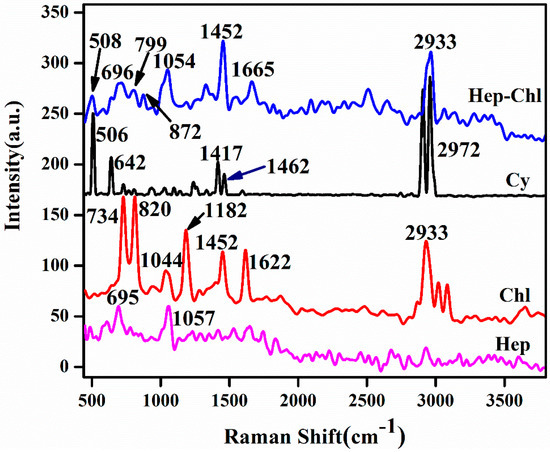 Raman spectra of heparin (Hep), chlorambucil (Chl), cystamine dihydrochloride (Cy), and the conjugate Hep–Cy–Chl.