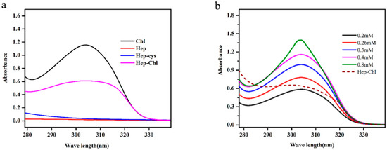 (a) UV-vis spectra of Hep, Hep-Cys, Chl, and Hep–Chl. (b) The concentration of Chl absorbance for the calibration curve at 304 nm.