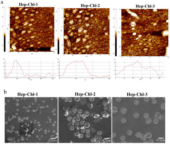 Particle morphology and size: (a) AFM images, (b) SEM images, and (c) particle size distribution Hep–Chl-1, Hep–Chl-2, and Hep–Chl-3 self-assembled prodrugs.