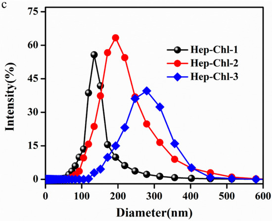 To study cellular internalization of the Hep–Chl nanoparticles, Rhodamine B was encapsulated with nanoparticles and used as a marker. The Hep–Chl conjugates were dissolved in DMSO by gently heating, and then added into aqueous Rhodamine B solution dropwise. The mixture was stirred overnight and dialyzed (MWCO 1 kDa cutoff) against distilled water at room temperature for 2 days to remove unbound Rhodamine B and DMSO. Then, an aqueous suspension containing Rhodamine B loaded with the self-assembled Hep–Chl nanoparticles was obtained, which were used to estimate cellular uptake. HeLa cells were seeded into a confocal dish at a density of 10 [5] cells/well and incubated at 37 °C under a humidified atmosphere with 5% CO2 overnight. The cells were treated with 0.8 mg/mL in medium and incubated for 3, 6, and 12 h. The culture media was discarded, and the cells were treated with DAPI (10 mg/mL) for 15 min for nucleus staining. Paraformaldehyde was used to fix the cells for 10 min at a temperature of 4 °C. Finally, the cells were imaged by confocal laser scanning microscopy (CLSM, Gyeonggi-do, South Korea).