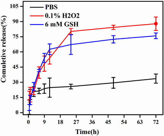 The redox-responsive release profile of Chl from the Hep–Chl prodrug nanoparticle was investigated using the dialysis method under simulated physiological conditions. For comparison, the release profile of Chl under normal physiological conditions (in PBS without any stimuli) was also studied. The prodrugs were incubated with cancer cells mimicking intracellular environment in PBS solution (pH 7.4) with 0.1% H2O2 and 6 mM GSH at 37 °C. The in vitro Chl cumulative release profile from the Hep–Chl prodrug nanoparticles is presented in Figure 5. Under normal conditions without any stimuli, the cumulative release of Chl was below 30% within 72 h, suggesting that the release of Chl from the prodrugs without redox stimuli was below 30%. However, the cumulative release of Chl in the redox stimuli in PBS containing 6 mM GSH and 0.1% H2O2 was found to be faster, and 75% and 85% of Chl was released, respectively, within 72 h. Both bioactive drugs, Hep and Chl, were covalently linked to each other by disulfide bonds, which could be cleaved to activate Hep and Chl through a reducing agent GSH and an oxidizing agent H2O2 [36,37,38]. Overall, this stimuli-responsive prodrug-based delivery system could facilitate the accumulation of drugs in tumor tissues and improve cancer therapeutic efficacy [14].