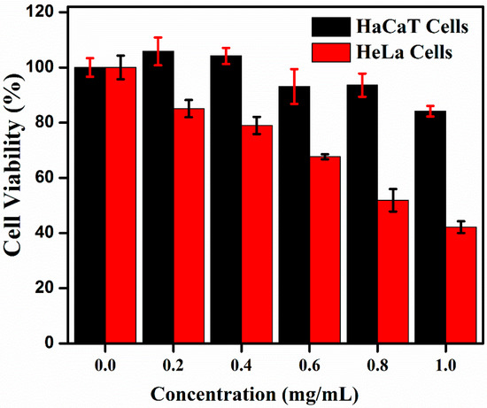 Cellular viability test was examined using the MTT assay with HeLa, HaCaT, and RAW264.7 cells. Both HeLa and HaCaT cells (1 × 104 cell/well) were cultured in DMEM containing 10% (v/v) FBS, 1% (w/v) sodium pyruvate, and 1% (w/v) streptomycin at 37 °C under a humidified atmosphere with 5% CO2 for 24 h. The media was discarded, the cells were treated with serial dilutions of Hep–Chl prodrug (0, 0.2, 0.4, 0.6, 0.8, and 1 mg/mL) for 24 h. The RAW264.7 and HeLa cells were further treated for 72 h with Chl alone (0, 0.2, 0.4, 0.6, 0.8, and 1 mg/mL) and Hep–Chl (mg/mL equivalent of Chl) for long term treatment evaluation. After treatment for each specific time, cells were washed three times and incubated with 20 µL of MTT (5 mg/mL) solution at 37 °C for 4 h. The MTT solution was removed and 100 μL of dimethyl sulfoxide (DMSO) was added to dissolve the formazan crystals. The absorbance of the sample was measured using an enzyme-linked immunosorbent assay (ELISA) reader (Thermo Multiskan FC microplate photometer; Thermo Fisher Scientific, Waltham, MA, USA) at 570 nm. Cell viability (%) was calculated using Equation (1).