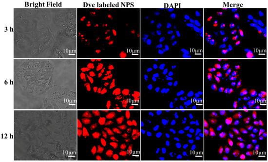 In vitro cellular uptake of Hep–Chl was also confirmed by detecting fluorescence emitted by Rhodamine B dye loaded into the nanoparticles by fluorescence microscopy [45,46,47] (Figure S5). HeLa cells were incubated with Rhodamine B-loaded Hep–Chl nanoparticles for 3, 6, and 12 h. As shown in Figure 8, the Rhodamine B-loaded Hep–Chl-treated cells displayed intense red fluorescence in the cytosol and nucleus, which indicates the presence of nanoparticles inside the cells and successful prodrug delivery. Cellular uptake of Hep–Chl prodrugs in HeLa cells was increased in a time-dependent manner.