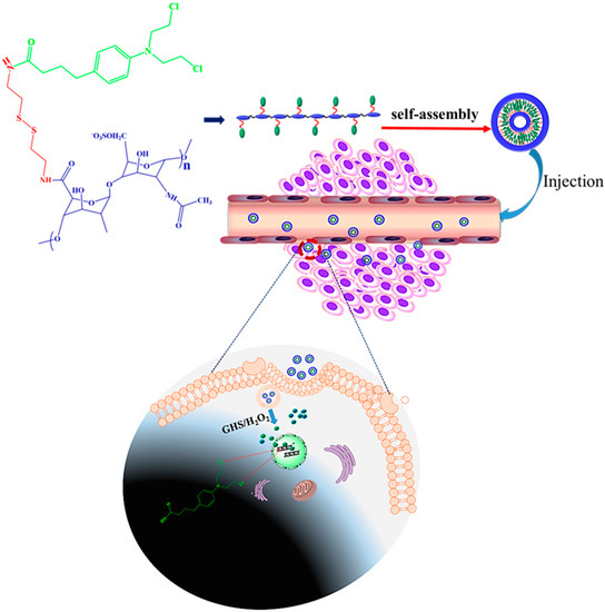 Heparin is a highly anioic natural polysaccharide commonly used as an anticoagulant in clinical practice [9,10]. It is water-soluble and extensively studied for different biomedical applications. Heparin can bind with various growth factors like basic fibroblast growth factor and vascular endothelial growth factor [11]. Previously, we demonstrated that heparin is an efficient anti-metastatic agent. The anticoagulant properties of heparin are mainly due to its pentasaccharide sulfate groups of unique binding affinity to anti-thrombin (AT)-binding domains. The removal of these sulfate groups from heparin results in a dramatic drop in anticoagulant activity, but its anti-metastasis effect remains active [12]. Therefore, the use of heparin as the backbone for grafting the anti-cancer drugs may augment the effectiveness of anti-cancer drugs with its synergistic anti-metastatic activity. Chlorambucil (Chl) is an aryl nitrogen mustard-based DNA-alkylating anti-cancer drug that has been widely applied for different types of cancer diseases. Chlorambucil’s mechanism of action in cancer cells is binding its two reactive chloroethyl side chains with the nucleobases adenine and guanine at N3 and N7 that halt DNA replication and DNA damage through DNA strand linking [13,14,15]. Chlorambucil has a low water solubility, short half-life due to rapid degradation in the plasma, and serious toxicity to normal tissues, which are potential limitations in its clinical applications [16,17]. Therefore, strategies to improve the stability, solubility, and non-specific toxicity of Chl are highly required to improve its anti-cancer effect. Furthermore, in the nanocarrier drug-delivery system, almost all drug vehicles have non-therapeutic potency by themselves. In some cases, the degradation of carriers may cause systemic adverse effects. Recently, drug–drug conjugates have been investigated as a promising approach in delivery systems [8,18]. For example, Ping et al. developed a self-assembling amphiphilic drug by conjugating two hydrophilic–hydrophobic anti-cancer drugs [19]. The two drugs were conjugated with an ester bond, which is hydrolyzed to release free drugs.