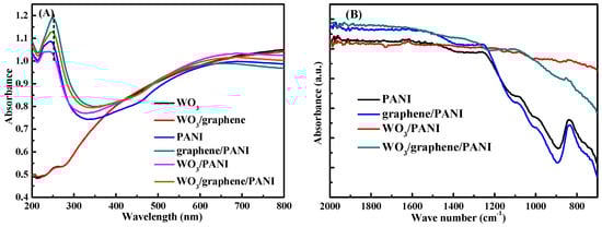 (A) UV-vis and (B) FT-IR spectra of bare WO3 film, double layer WO3/graphene film, pristine PANI film, double layer graphene/PANI film, double layer WO3/PANI film, and triple layer WO3/graphene/PANI film, respectively.