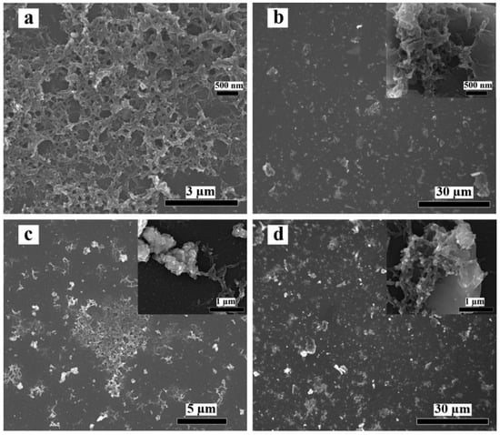 SEM images of (a) pristine PANI film, (b) graphene/PANI film, (c) WO3/PANI film, and (d) WO3/graphene/PANI film. Inset is the magnification of corresponding SEM image.