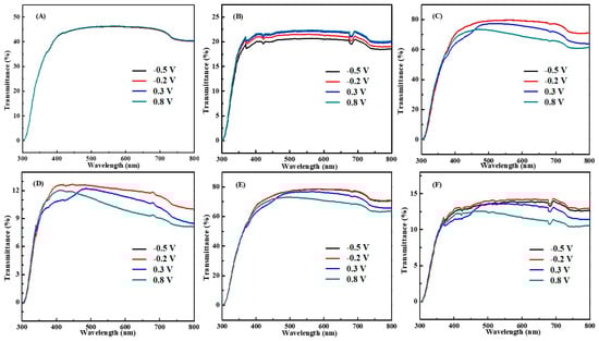 UV-vis spectra of (A) pure WO3 film, (B) double layer WO3/graphene film, (C) pristine PANI film, (D) double layer graphene/PANI film, (E) double layer WO3/PANI film, and (F) triple layer WO3/graphene/PANI film in 0.5 M H2SO4 aqueous solution at different potentials as −0.5, −0.2, 0.3, and 0.8 V.