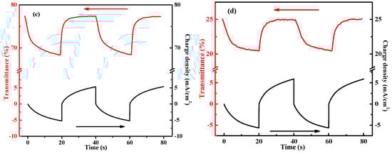 The coloration switching responses as an important parameter is vital to evaluate the electrochromic performance in terms of energy consumption and coloration switching. The coloration properties of all the PANI-based nanocomposites films were studied by applying potential steps of 0.8 and −0.2 V with a pulse width of 20 s. Figure 5a–d shows the transmittance-time (red) and the corresponding charge density-time curves (black) at 633 nm under an alternative square-wave voltage of 0.8 and −0.2 V with 20 s interval. The transmittance modulations, transmittance difference between the bleached and colored states in the electrochromic materials, as 6.12, 1.71, 9.04, and 4.52% are calculated for the pristine PANI, double layer graphene/PANI, double layer WO3/PANI, and triple layer WO3/graphene/PANI nanocomposites films, respectively. Decreased transmittance modulations of graphene contained films confirm further the block effect of the introduced graphene.