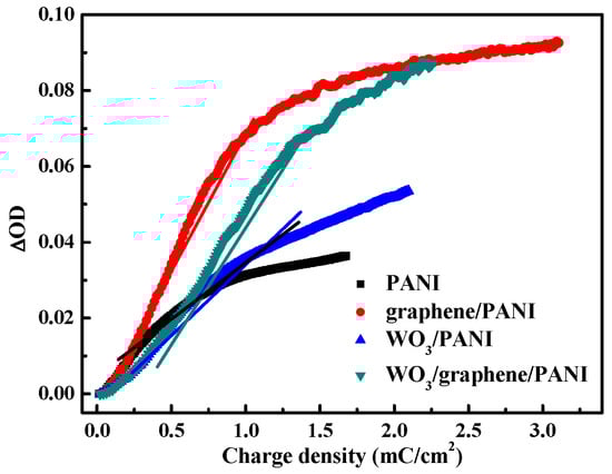 The plots of in situ optical density (ΔOD) versus charge density of pristine PANI film, graphene/PANI film, WO3/PANI film, and WO3/graphene/PANI films. The optical density was measured at 633 nm at 0.8 V in 0.5 M H2SO4 aqueous solution.