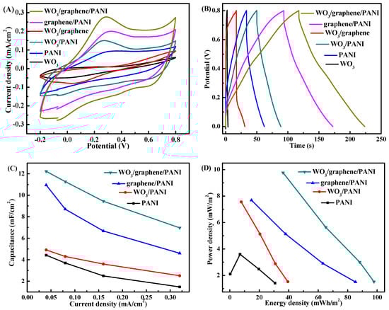 (A) CVs conducted at a scan rate of 50 mV/s, (B) charge-discharge curves with a current density of 0.08 mA/cm2, (C) specific capacitances depended on current density, and (D) Ragone plots of bare WO3 film, double layer WO3/graphene film, pristine PANI film, double layer WO3/PANI film, double layer graphene/PANI film, and triple layer WO3/graphene/PANI film measured in 0.5 M H2SO4 aqueous solution.