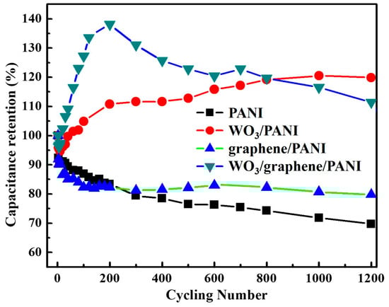 Since a long cycling performance is of the most important criteria for supercapacitors, the cycling performances of these four PANI-based films were conducted by GCD for 1200 cycles with a current density of 0.16 mA/cm2. The cycling performances with specific capacitance retention are shown in Figure 9. It is clearly seen that all the PANI-based nanocomposites films exhibit much better cycling performance than that of pristine PANI. For example, the graphene/PANI has an 80% retention, higher than that of pristine PANI (70%), indicating the positive role of graphene which is also consistent with reported works [,]. However, both the WO3/graphene and WO3/graphene/PANI electrodes have slight capacitance increases during the cycling process. The capacitance increases can be attributed to the introduced WO3 nanoparticles, which were increasingly accessed along with cycling. The WO3 particles used in this work have a nanoscale size around 40–50 nm, indicating a high specific surface area of the nanoparticles. Therefore, a combined electric double-layer capacitance from high surface area and pseudo-capacitor capacitance from redox reactions can be delivered by WO3 nanoparticles. Accompanied by the charge-discharge cycles, the activation and volume change of WO3 nanoparticles lead to higher pseudo-capacitor capacitance from more redox active sites, that is, enhanced capacitance during cycling. The cycling performance of the as-prepared PANI films follows the order as WO3/PANI > WO3/graphene/PANI > graphene/PANI > pristine PANI, which implies the WO3/graphene/PANI film is capable to serve as a promising supercapacitor material because of its much-enhanced capacitance and cycling performance. The above results clearly reveal the potential applications of this triple layer WO3/graphene/PANI for supercapacitors, while also highlighting again the positive effects of WO3 and graphene nanofillers on the PANI matrix.