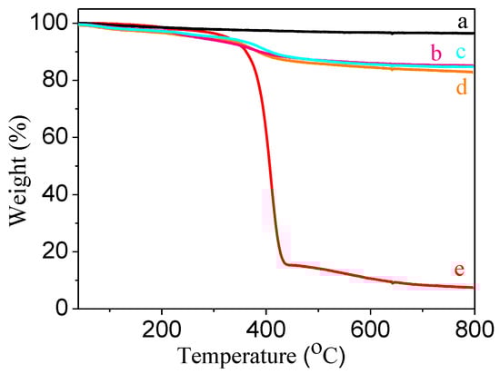 Thermogravimetric analysis (TGA) curves of (a) the bare SiO2 (black line), (b) SiO2@poly(2-vinyl pyridine)-b-poly(ethylene oxide) (P2VP-b-PEO)_1 (pink line), (c) SiO2@P2VP-b-PEO_2 (cyan line), (d) SiO2@P2VP-b-PEO_3 (orange line), and (e) P2VP-b-PEO (red line).