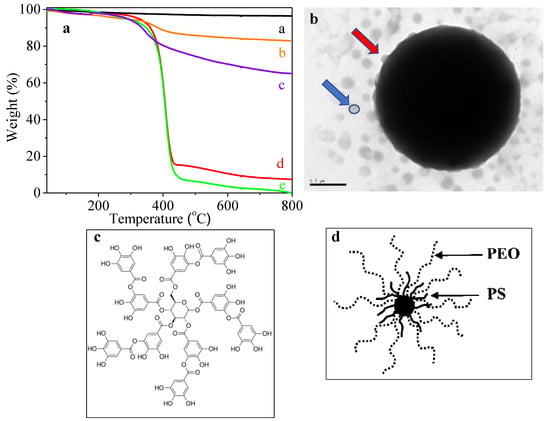 (a) TGA curves of (a) the bare SiO2 (black line), (b) SiO2@P2VP-b-PEO (orange line), (c) SiO2@P2VP-b-PEO@tannic acid (TA)@ polystyrene–poly(ethylene oxide) (PS10-PEO10) (purple line), (d) P2VP-b-PEO (red line), and (e) PS10-PEO10 (green line); (b) TEM image of an SiO2@P2VP-b-PEO@TA@PS10-PEO10 particle, scale bar: 500 nm; the blue and red arrows indicate the free and adsorbed PS10-PEO10 micelles, respectively. (c) Molecule of tannic acid; (d) a monomolecular micelle of the star-shaped PS10-PEO10 copolymer.