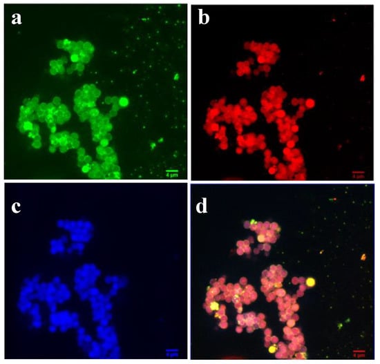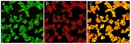 Indeed, calcein and Nile Red encapsulation in the interior of the particles and the PS10-PEO10 polymer coating of the mesoporous silica particles, respectively, was confirmed by optical observation by means of confocal microscopy. In Figure 5, the images of SiO2@calcein@P2VP-b-PEO@TA@PS10-PEO10/Nile Red particles are shown. The green color in Figure 5a and the red color in Figure 5b are attributed to calcein and Nile Red fluorescence, respectively, and these colors are indicative of the fact that the SiO2 particles encapsulated calcein, and that they were effectively coated with the PS10-PEO10/Nile Red polymer layer. After merging the images of Figure 5a,b, the green and red fluorescences completely overlapped (Figure 5c), which further confirmed the PS10-PEO10/Nile Red layer on the silica particles.