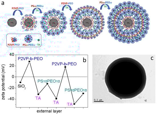 Afterward, the PS10-PEO10 solution was added, and the adsorption of the new layer onto the hybrid particle surface was proven as the zeta potential changed from −31 mV to −12 mV. In this case, the PEO arms of PS10-PEO10 formed hydrogen bonds with TA. Again, after addition of TA to the system, the zeta potential became more negative, −39 mV, confirming the TA deposition through hydrogen bonding. Next, P2VP-b-PEO was added, and the zeta potential exhibited a positive value of +18 mV, indicating that ionic interactions again came into play. Evidently, the positively charged P2VP blocks overcompensated for the negative charges of TA. The LbL procedure was continued with another bilayer (TA and PS10-PEO10). Reversal from +18 mV to −49 mV and finally to −29 mV confirmed the successful deposition of this bilayer. Therefore, by monitoring the zeta potential values of silica hybrids after the adsorption of each layer, the successful deposition of the different copolymers on the particles surface was confirmed (Figure 6a), which was achieved by a combination of ionic interactions and hydrogen bonding with the aid of TA. In Figure 6c, a TEM image of an isolated multilayered hybrid microparticle is also demonstrated, showing almost uniform deposition of the various layers with limited defects.