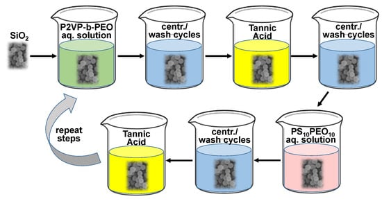 The LbL technique is an excellent process to integrate both types of the selected polymers onto the MSPs. In the present case, it was based on two different mechanisms. The first layer of P2VP-b-PEO, coating the surface of the SiO2 particles, interacts with the silica surface through ionic interactions between the negatively charged silica and the positively charged P2VP block. The next layers are deposited through the formation of hydrogen bonds between the PEO blocks of the P2VP-b-PEO and PS10PEO10 copolymers using intermediate tannic acid (TA) layers. TA is a polyphenol with characteristic antioxidant, anticarcinogenic, antimicrobial, and antibacterial properties that can interact with various molecules through several mechanisms (electrostatic interactions, hydrophobic interactions, hydrogen bonding, etc.) [,,,,]. It was used with the LbL technique forming multilayer assemblies via hydrogen bonding with pH-responsive, thermo-responsive, or neutral polymers including TA/poly(allylamine) (PAH) [], TA/poly(N-vinylpyrrolidone) (PVPON) [,,,], TA/poly(ethylene oxide) (PEO), TA/poly(ethylene glycol) (PEG) [,,], TA/poly(N-vinylcaprolactam) (PVCL) [], and TA/poly(N-isopropylacrylamide) (PNIPAM) [].