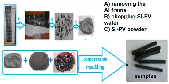 - Cosnita, M.; Cazan, C.; Duta, A.; Visa, I. Recycling Silicon-PV Modules in Composites with PVC, HDPE and Rubber Wastes. In Conference on Sustainable Energy; Springer: Berlin/Heidelberg, Germany, 2017; pp. 375–394. [Google Scholar]