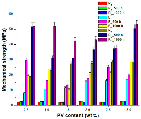 | Si-PV (wt %) | RT (MPa) | Sd (for RT) | E (MPa) | RC (MPa) | Sd (for RC) | RI (kJ/m2) | Sd (for RI) |