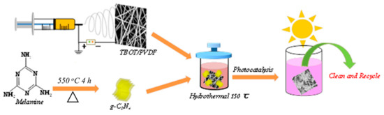 As shown in Figure 1, TPCN were synthesized by combining the facile electrospinning method, sintering and a controllable hydrothermal process [31]. First, TBOT/PVDF fibers were obtained using convenient and simple electrospinning technology [28,33]. Secondly, g-C3N4 was collected by one-step sintering [36]. Later, the cut TBOT/PVDF (2.5 cm × 2.5 cm) and a certain amount of g-C3N4 were placed into a 50 mL reactor for hydrothermal treatment to prepare flexible TPCN. The photocatalyst contaminated with the dyes was subjected to a period of light irradiation to study the photocatalytic performance. Finally, collecting and cleaning the flexible TPCN composite was collected and cleaned from the solution for next reuse.
