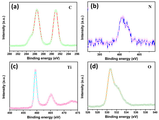 HR-XPS spectra of TPCN2 composite synthesized at 150 °C for 24 h: (a) C 1s (b) N 1s, (c) Ti 2p and (d) O 1s.