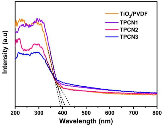 The UV-Vis absorption spectra in Figure 6 were used to confirm the optical absorption properties of the TiO2/PVDF, TPCN1, TPCN2 and TPCN3, which were obtained by converting the UV-Vis diffuse reflectance spectra using the Kubelka−Munk function [53,54]. The curves of the TiO2/PVDF suddenly and abruptly decreased at around 400 nm, indicating that there was no response in the visible range, and the response was in the ultraviolet range, owing to the formation of TiO2 on the fibers. After adding various contents ofg-C3N4, the curves exhibited enhanced responses between 400 and 750 nm. The reason for the decrease in absorption in the UV region was that the addition of g-C3N4 obstructed the ultraviolet absorption of some of the TiO2, increasing the absorption in the visible region. Thus, the curves proved that the range of light captured by the photocatalysts extended to the visible light region because the g-C3N4 was bonded to the TiO2/PVDF fibers during the hydrothermal process. We make the tangent intersect the abscissa axis and show the absorbance of various components. As the content of g-C3N4 added during the hydrothermal process increased, the response of the TiO2/PVDF/g-C3N4 in the visible light region gradually increased. By extrapolating the Kubelka−Munk function, the band gap energy of the as-prepared products was estimated to be 2.6–3.15 eV. As shown in Figure 6, the curves of TPCN1, TPCN2 and TPCN3 exhibited a blue shift in the band gap energy compared to the TiO2/PVDF and began to respond to the visible light region.