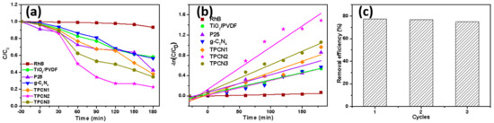 By detecting the change of the RhB concentration under visible light irradiation for a period of time, the photocatalytic performances of the as-prepared composites were evaluated. The sample was treated in a dark environment for 30 min to achieve adsorption equilibrium. Figure 7a shows the RhB degradation curves of the as-prepared photocatalysts under the same conditions, including P25®, TiO2/PVDF, g-C3N4, TPCN1, TPCN2 and TPCN3. RhB without an added photocatalyst was used as a blank control group to confirm the inherent stability of the solution under visible light irradiation. As expected, a negligible change in the concentration of RhB occurred. The curves showed that TPCN2 exhibited a higher photocatalytic performance for degrading RhB than other types of photocatalysts. In particular, the photocatalytic activities of various TPCN composites were higher than those of the g-C3N4 and TiO2/PVDF fibers, which indicated that the amount of g-C3N4 coupled with TiO2/PVDF fibers significantly affected the photocatalytic activity during the reaction process. The effective separation of electron and holes pairs and the expanded specific surface area affected the interfacial contact of the g-C3N4 and TiO2 in the composite system. The proper amount of g-C3N4 added to the composite can significantly affected the efficiency of the photocatalysis. The photocatalytic process for the degradation of RhB can also be expressed using pseudo-first-order kinetics, as follows: [55]