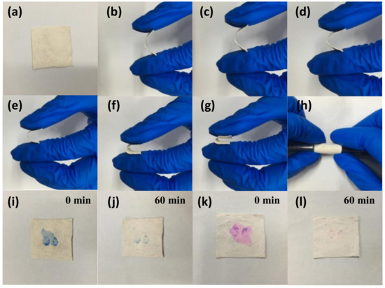 Photographs: flexible performance of TPCN2 (a–h), stained with MB (i,j) and RhB (k,l) under UV light irradiation, respectively.