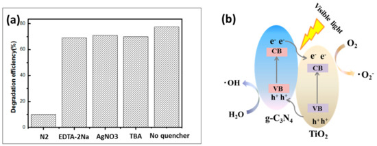 To further study the possible reaction mechanism of the prepared photocatalyst, a series of comparative experiments of radical scavengers were carried out in the reaction system to determine the active material leading to the photocatalytic process. The scavengers N2, EDTA-2Na, AgNO3 and TBA were added to the removal of the active substances , h, to further study the possible reaction and OH, respectively. As shown in Figure 9a, the photocatalytic properties changed slightly after the addition of EDTA-2Na, AgNO3 and TBA, which means that h, e− and played minor roles in the degradation of RhB. When N2 was added to the solution, the degradation efficiency of the CNT2 for RhB decreased sharply, indicating that ∙ played a leading role in the photocatalytic degradation of the pollutants. Based on the above results, a photocatalytic mechanism of the CNT degradation of the pollutants under visible light irradiation was proposed. The mechanism of photogenerated carrier transfer and separation under visible light irradiation is shown in Figure 9b. When the light irradiated the sample, an electron (e−) was excited from the valence band (VB) of g-C3N4 to the conduction band (CB), leaving equal numbers of holes (h+) in the VB. Therefore, the separation of photogenerated carriers inherent in the material was realized. Meanwhile, an electron (e−) of TiO2 was excited from the VB to the CB, leaving the same number of holes (h+) into VB. Since the VB potential of TiO2 was lower than that of g-C3N4, the electrons were rapidly transferred from the CB of g-C3N4 to the CB of TiO2 through the tightly contact interface. Thus, the holes moved from the VB of TiO2 to the VB of g-C3N4. Eventually, the survival time of the photogenerated carriers was prolonged, which was beneficial to the enhancement of the photocatalytic activity. The electrons transferred to the CB of TiO2 were trapped by oxygen molecules in the dye solution, and thus a strong oxidizing oxygen radical (∙) formed on the surface of the sample () [58]. Meanwhile, hydroxyl radicals () were also produced on the surface of the photocatalyst due to the holes of the VB transferred to the g-C3N4 reacting with water molecules in solution, () [59]. The ∙ and attached to the sample surface had strong oxidizing properties. In the process of contacting with organic pollutant RhB, the RhB finally mineralized into H2O and CO2 after undergoing the processes of N-demethylation, chromophore cleavage, ring-opening and mineralization [60].