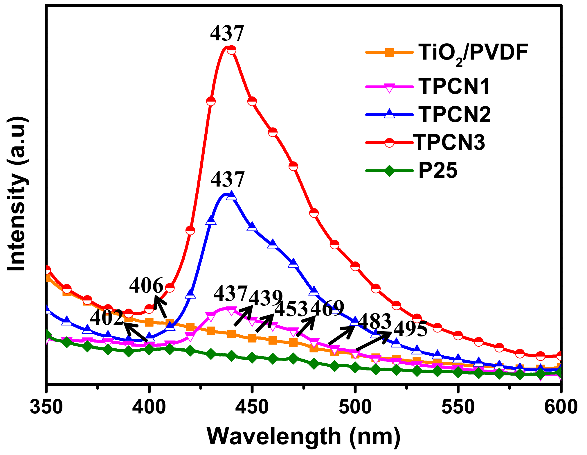 The PL spectra were used to determine the recombination efficiencies of the photogenerated carriers and characterize the electron hole pair transfer behavior at the contact interface. The PL spectra of the TiO2/PVDF fibers and TiO2/PVDF fibers with different contents of g-C3N4 are shown in Figure 5. The TiO2/PVDF and P25® both produced four main emission peaks. The emission peak approximately 406 nm was due to the TiO2/PVDF, while the peak located at approximately 402 nm was due to the P25®. The position of these two peaks may have been caused by the near-band edge emission of TiO2 and P25® [49,50]. In the various as-prepared TPCN composites, the emission peaks for TiO2/PVDF and P25® were all transferred to a position of 437 nm, which was caused by the combination of g-C3N4. As the content of g-C3N4 used in the reaction solution increased, the intensity of the emission peaks for different TPCN contents increased, because g-C3N4 has a strong recombination rate of photogenerated carriers as previously reported [42]. In addition, five emission peaks still appeared for the TiO2/PVDF and P25® between 439 and 495 nm, which were assigned to the oxygen vacancy related defects occurring in the preparation process [51,52].