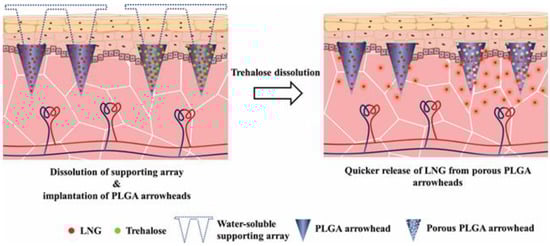 In our study, implantable PLGA microneedles (IPMNs) were fabricated by integrating the drug-loaded PLGA arrowheads and a water-soluble supporting array. LNG, a potent progestogen with high hydrophobicity (Log P = 3.88), was selected as the model drug [,]. N-methyl-2-pyrrolidone (NMP), a biocompatible solvent with strong solvating ability [,,], was chosen for the PLGA arrowhead formulation. Trehalose can fully dissolve in NMP as well as water, which allows it to be well dispersed in the PLGA matrix and then leave holes in PLGA arrowheads after exposure to water. Therefore, trehalose was selected as a porogen; a schematic illustration is shown in Figure 1. Once inserted, LNG-loaded PLGA arrowheads were implanted into the skin after the water-soluble supporting array dissolved. The porous PLGA arrowheads were created by the dissolution of trehalose in the interstitial fluid in the skin, resulting in a quicker release of hydrophobic LNG. In this paper, the skin penetration capability, insertion depth, and dissolution performance of IPMNs were studied. Moreover, effects of trehalose on both the LNG release from IPMNs and the degradability of PLGA arrowheads were investigated.