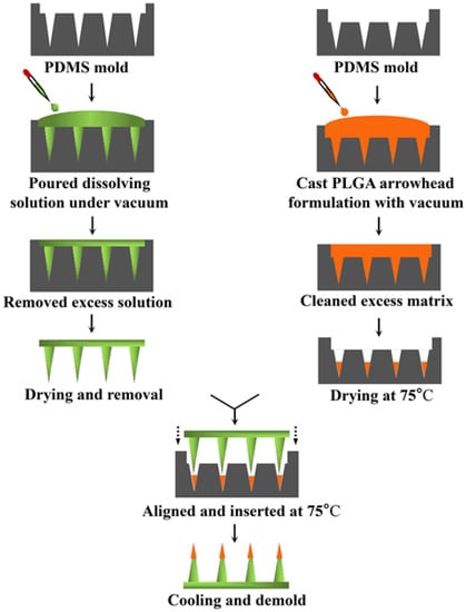 The IPMN fabrication process is summarized in Figure 2. A dissolvable solution consisting of 10% (w/w) PVA and 20% (w/w) PVP-k120 was cast in a PDMS mold. MN cavities were filled with a dissolvable matrix under vacuum for 5 min. Then, the excess matrix on the outside of the mold was cleared away using a plastic plate. Next, the mold was placed under 30% relative humidity at room temperature (RT) for 4 h. Then, water-soluble MNs were acquired by removing them from the mold.