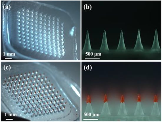 (a) Stereomicroscopic image of water-soluble MNs. (b) Side view of water-soluble MNs. (c) Stereomicroscopic image of FR-loaded IPMNs. (d) Side view of FR-loaded IPMNs.