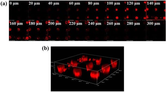 To further evaluate the insertion depth of IPMNs, the treated skin was investigated by CLSM analysis. Figure 4a shows that the fluorescence intensity increased initially and gradually lessened after attaining a maximum value at varying depths. The fluorescence intensity disappeared at a depth of 300 μm. Thus, the insertion depth of IPMNs was approximately 300 μm longer than the height of PLGA arrowheads. A 3D image of nine implantation sites created by FR-loaded IPMNs in the porcine ear skin is displayed in Figure 4b, which visually indicates that PLGA arrowheads were completely implanted into the skin as drug depots. These results made it possible to dramatically improve drug utilization [,,].