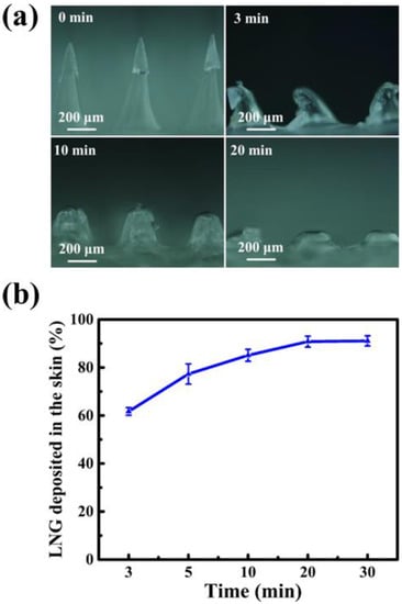 The morphologies of LNG-loaded IPMNs before and after insertion in vitro were investigated through dark field micrographs (Figure 5a). The water-soluble supporting arrays could dissolve in 20 min, leading to the gradual disappearance of water-soluble MNs and the implantation of LNG-loaded PLGA arrowheads into the skin. As shown in Figure 5b, the percentage of LNG deposited in the skin increased with the application time. After attaching for 20 and 30 min, the percentages of LNG deposited in the skin were 90.8 ± 2.3% and 91.1 ± 2.1%, respectively. However, these two groups showed no significant difference (p > 0.05). Therefore, 20 min was the optimal application time. This result provided a valuable reference for subsequent in vitro and in vivo experiments.
