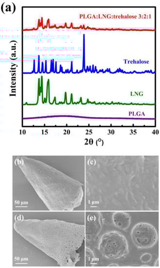 (a) XRD patterns of PLGA, LNG, trehalose (dehydrate) and the dried powder of PLGA arrowhead matrix (containing PLGA:LNG:trehalose with a mass ratio of 3:2:1). (b–e) Morphologies of PLGA arrowheads with or without trehalose after immersion in water: (b) PLGA arrowhead without trehalose, (c) enlarged picture of (b), (d) PLGA arrowhead with 33.3% trehalose, (e) enlarged image of (d).