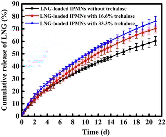 The LNG release curves of IPMNs with different PLGA arrowhead formulations (such as different ratios of PLGA to LNG and different contents of trehalose) were accomplished with dialysis bags. IPMNs were placed in a dialysis bag and hung in a conical flask with a dissolving medium (40% polyethylene glycol 400-PBS, pH = 7.4). Then, the conical flask was placed in a 37 °C water bath with magnetic stirring (280 r/min) []. Samples were collected from the release medium at specified time intervals and replenished with the same volume of fresh medium. The amount of LNG in each sample was detected by HPLC after centrifuging the sample for 10 min at 10000 r/min. The experimental conditions of HPLC were the same as those described in Section 2.5.