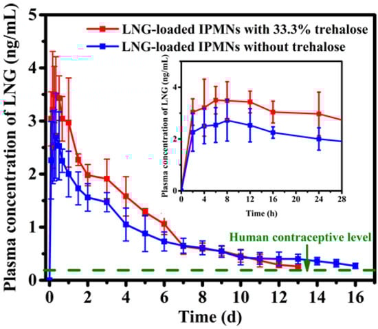 The AUC for LNG release from IPMNs with 33.3% trehalose was obviously higher than that without trehalose (p < 0.05). The accelerated release kinetics of LNG could also result in a higher bioavailability of LNG for IPMNs with 33.3% trehalose than those without trehalose at the same dose. Additionally, the AUC value of subcutaneous LNG injection was 310.3 ± 58.3 ng·h/mL (Figure S5 and Table S3), which indicated that the bioavailability of LNG delivery from IPMNs with 33.3% trehalose was similar to subcutaneous LNG injection (p > 0.05). Importantly, the pain and fear caused by injection would not be present with IPMNs [,].