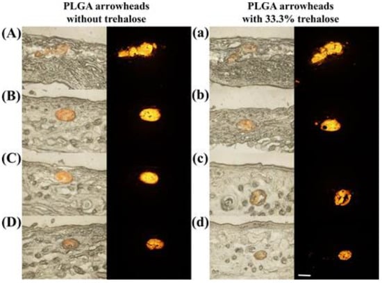 To visualize the effects of trehalose on the PLGA degradation rate, FR-loaded IPMNs without trehalose and with 33.3% trehalose were inserted into rat skin in vivo. Figure 9A,a shows that FR-loaded PLGA arrowheads were left completely embedded in the skin after peeling off the IPMNs. Moreover, for these two groups, the morphologies of the PLGA arrowheads were equivalent at the beginning. Then, the PLGA arrowheads gradually eroded over time. Figure 9B–d show that the residual PLGA arrowheads with trehalose were smaller than those without trehalose at the same time points. These results indicate that the PLGA matrix with trehalose degraded quickly. At three weeks after application, the PLGA arrowheads for these two groups were not completely eroded, and remained in the skin. However, the eroded PLGA arrowheads with trehalose were visibly smaller than those without trehalose. Based on morphologies of the residual PLGA arrowheads, it could be predicted that the erosion period of PLGA arrowheads with 33.3% trehalose was approximately 4–6 weeks, and that of those without trehalose was approximately 6–8 weeks. For PLGA arrowheads with 33.3% trehalose, the porosity was caused by the dissolution of trehalose. The porous structure could result in a higher specific surface area, which expedites the degradation rate of PLGA []. Additionally, the PLGA degradation could contribute to drug delivery [].