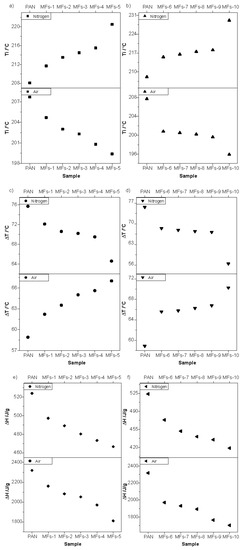 Thermal properties of PAN and modified PAN fibers (MFs) characterized through differential scanning calorimetry (DSC) in air and nitrogen, in the (a,b) initial temperature of heat releasing (Ti), (c,d) temperature interval (ΔT) of Ti and Tp1, and (e,f) nominal heat release (ΔH) of PAN and MFs.