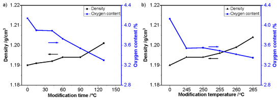 As shown in Figure 3, it was obvious that the oxygen content changed as a function of the pretreatment temperature and time. With the increase of pretreatment temperature or time, the oxygen content of PAN fibers decreased. This indicates that the original oxygen within the PAN copolymer was removed during the process of pretreatment. The densities of PAN fibers increased with the enhancement of pretreatment temperature and pretreatment time. This indicates that both the chemical and physical structural evolutions during thermal pretreatment in nitrogen led to a denser structure of PAN fibers.