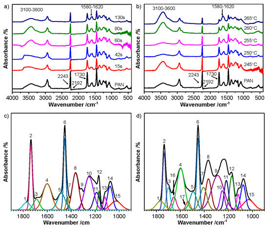 FTIR spectra of PAN and MFs pretreated (a) at 245 °C for different time and (b) at different temperatures for 90 s, and multi-peak fitting of (c) PAN precursor fibers and (d) MFs.