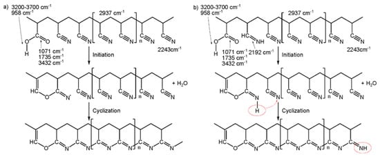 Suggested mechanism of thermal pretreatment in nitrogen, (a) the standard PAN copolymer of AN/IA/MA and (b) the PAN copolymer with hydrolysate of nitrile groups.