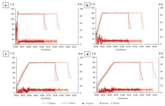 Monitoring of the temperature (°C) and microwave power supplied (%) during predefined heating programs: (a) M1, M5; (b) M2, M6; (c) M3, M7; (d) M4, M8.