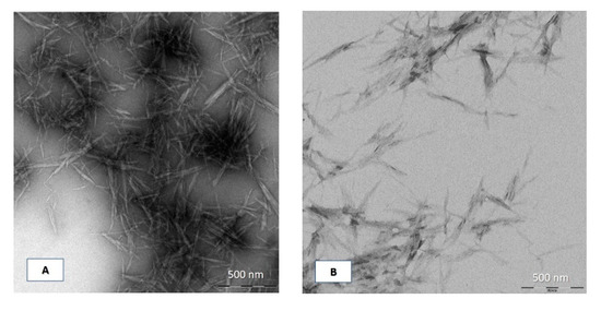 The morphology and geometric dimensions of the nanocrystals (length, width, aspect ratio) strictly depend on the exact conditions in which the hydrolysis occurred, as well as on the cellulose source used [43]. On the basis of this consideration, a characterization of the actual shapes, particle dimensions, and length distributions of CNCs, via transmission electron microscopy (TEM) and by dynamic light scattering (DLS), was performed. The electronic micrographs (Figure 2A,B) revealed rather similar aggregates of the two sets of nanocrystals produced, with typical rod-like crystal structure and a rather high aspect ratio (greater than 20). The measured widths were approximately in the order of few nanometers (around 7 nm), for both kind of CNCs, while their length ranged over a larger window, from some tens (≈80 nm) to a few hundreds of nanometers (≈400 nm), with an average value of around 170 nm. However, it is known from the literature that CNCs generally have a relatively wide length distribution, owing to the controlled nature of the progress of the hydrolytic process [44]. Moreover, the dimensions of the cellulose nanocrystals were comparable to those from previously reported works [8].