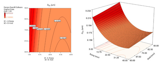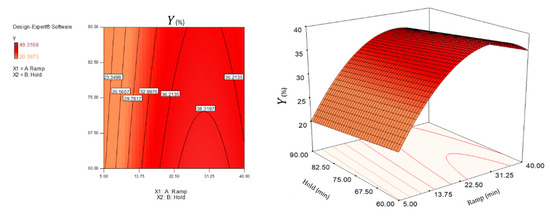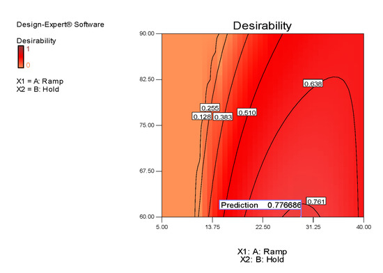 The two independent variables, ramp time (X1) and hold time (X2), were statistically explored, subjecting the data to a two-way analysis of variance (ANOVA) to determine the effects of the factorial combination of X1 (quantitative factor on four levels) and X2 (quantitative factor on two levels), each of which was repeated four times. The statistical significance of the model was determined by evaluating the p-value, F-value, and lack of fit at a 95% confidence level. The statistical treatment of the experimental data also consisted of fitting a polynomial function to the set of data collected from multilevel factorial design, by means of the least squares method. The extent of fitting was expressed by the adjusted determination coefficient (R2adj). Response surfaces were then obtained using the fitted model and keeping one independent variable constant while varying the other variable. Furthermore, to obtain the process settings achieving peak performance, a numerical optimization function was used to find the maximum desirability for all responses simultaneously, combining all the data into a single desirability function (D), through the geometric mean (Dj) of the individual desirability.