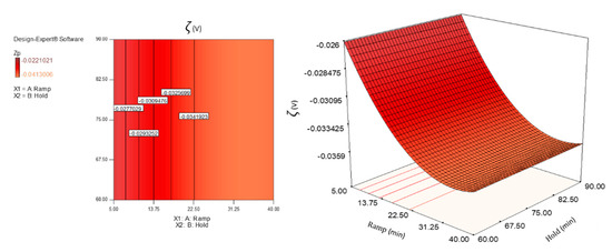 Response surface (right) and contour plot (left) showing the effect of ramp (X1) and hold (X2) on the response variable Zeta potential (ζ)