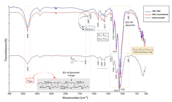 Fourier transform infrared spectroscopy (FTIR)-attenuated total reflectance (ATR) spectra (4000–600 cm−1) of cellulose nanocrystals (CNCs) from microwave (–––blue line) and conventional (–––red line) methods in comparison with the raw cotton powder (–––purple line).